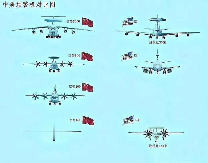 预警机作为空中指挥控制核心,负责目标探测、情报汇总与战机引导,是现代空战体系的“战力倍增器”,中美两国在预警机技术上各有优势。