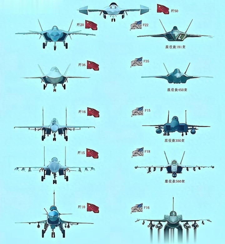 战斗机(歼击机)是夺取制空权、实施空中拦截与精确打击的核心装备,中美两国均构建了轻重搭配、新旧衔接的机型体系。
